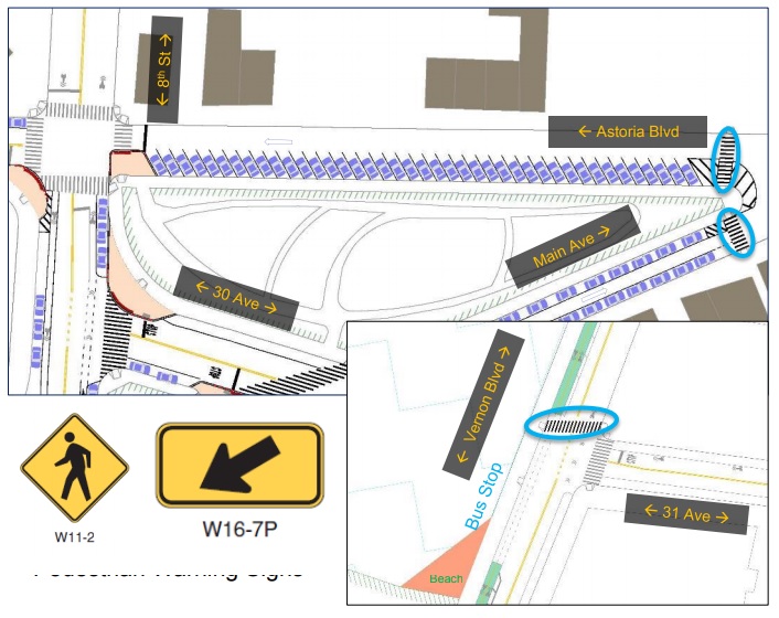 Two enhanced crossings will be installed at Astoria Boulevard and Main Avenue and another would be installed at Vernon Boulevard and 31st Avenue. Pedestrian warning signs will also be installed.