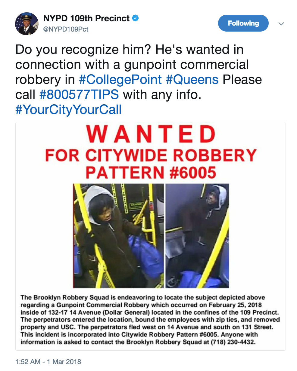 In a post to the 109th Precinct‘s Twitter account, Inspector Judith Harrison published a wanted poster with the image of a man believed to have involved in the Feb. 25 caper, which occurred at 8:30 a.m. inside the Dollar General shop located at 132-13 14th Road.