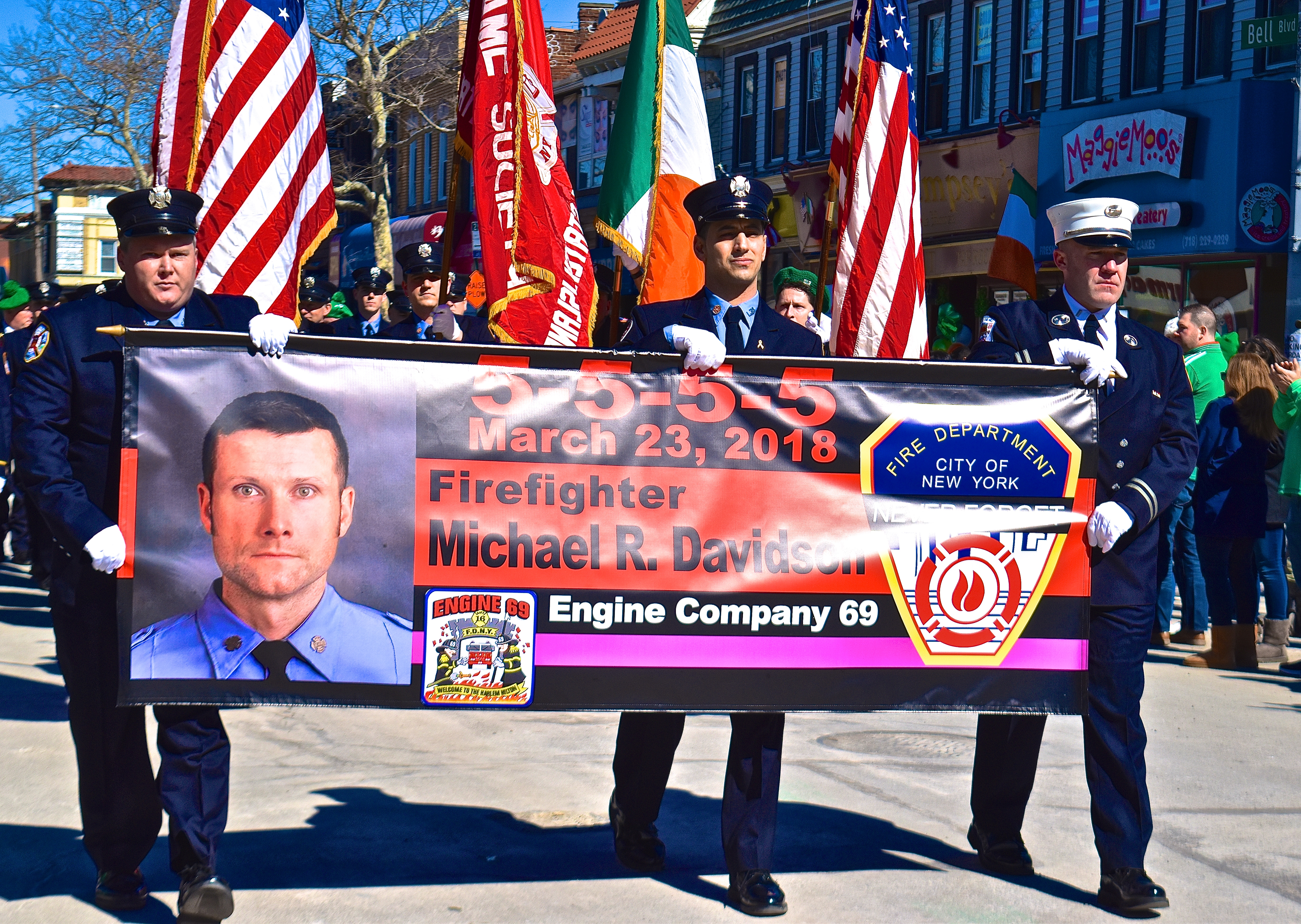 Along with celebrating Irish heritage, the members of the Fire Department in attendance paid special homage to Firefighter Michael Davidson, who died the previous day while fighting a fire in Manhattan. They carried a banner bearing his image and the numbers 5-5-5-5 — the signal the FDNY uses when announcing a line-of-duty death.