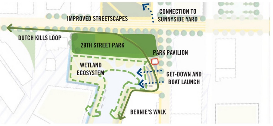 In a section focusing exclusively on the Dutch Kills tributary, the section of the Creek extending up to 47th Avenue between 27th and 29th Streets, the vision plan imagines an “environmental and recreational oasis” for the community. Several projects along the waterway tie together to make the “Dutch Kills Loop”, a proposed 1.4-mile public park and walkway.