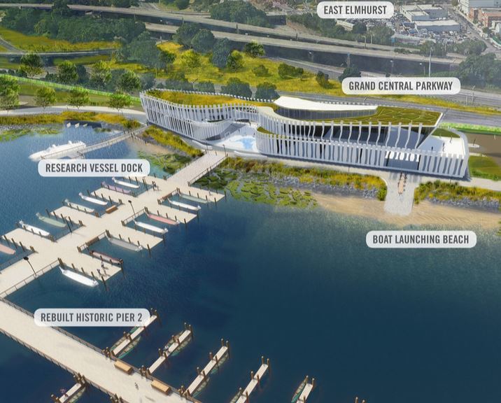 The Queens Water Exploration Center, located along the Bay promenade, would bring a “harmony of science, water and sport” with a 40,000-square-foot community structure. The public hub would feature year-round events, including tours and educational seminars, food festivals and boat races.