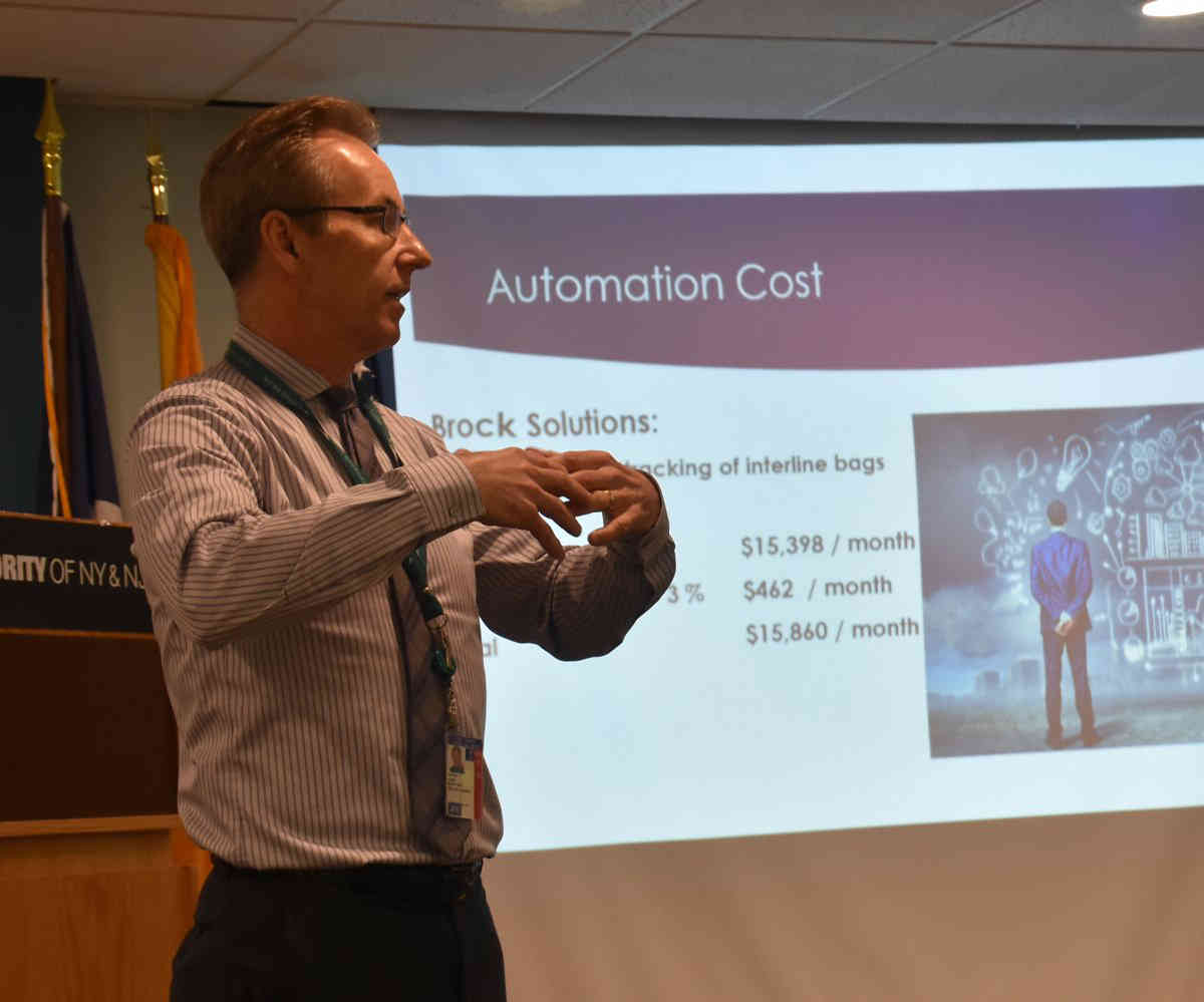 The Interline baggage contract is in its second year, and according to Groark and other users, it is a successful contract for the airlines in handling inter-flight baggage transfer. Groark said this is an excellent service, cost effective and extremely reliable with over a 99% success rate in moving the bags within the 20 minute window of opportunity. He expressed great confidence is the ability to have a control of the location of bags throughout the flight travel and this can be seen from the software used for this application. It is the plan for the Interline project to be able to satisfy the needs of all the carriers at the airport and an to bring down the cost by having each additional carriers sign on. Benefits include excellent tracking of bags , quick transfer, dedicated service , setting technology automation, new vehicles with a 65 person staff to handle the operation,