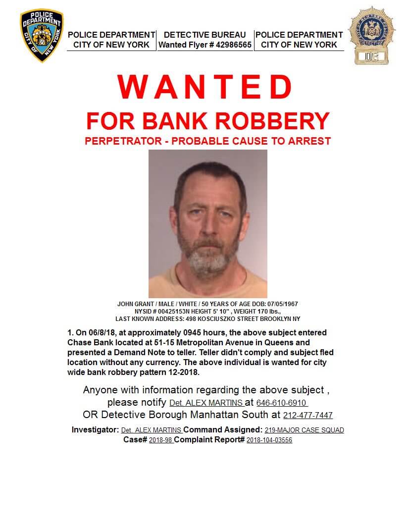 According to information in a wanted flier posted on the 104th Precinct’s Twitter account, detectives have linked Grant to an active citywide bank robbery pattern.