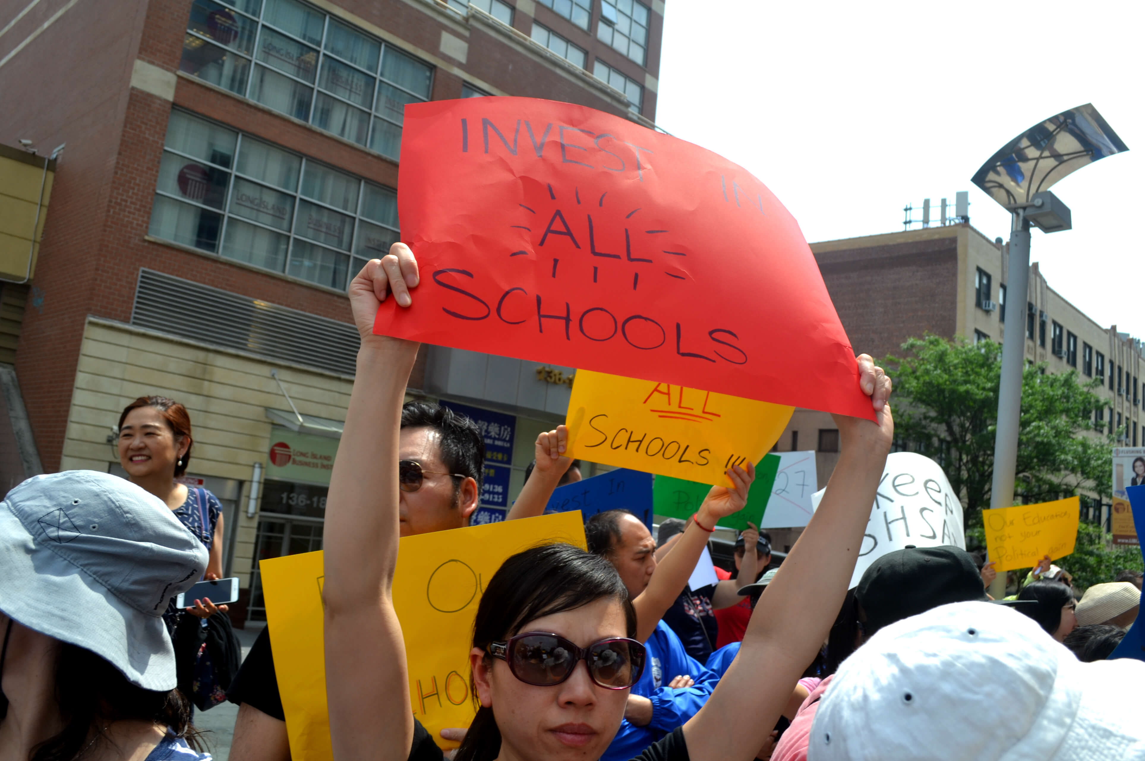 The June 8 rally was organized by state Senator Toby Ann Stavisky, who called the mayor and chancellor’s move “disgraceful, dangerous and divisive.”