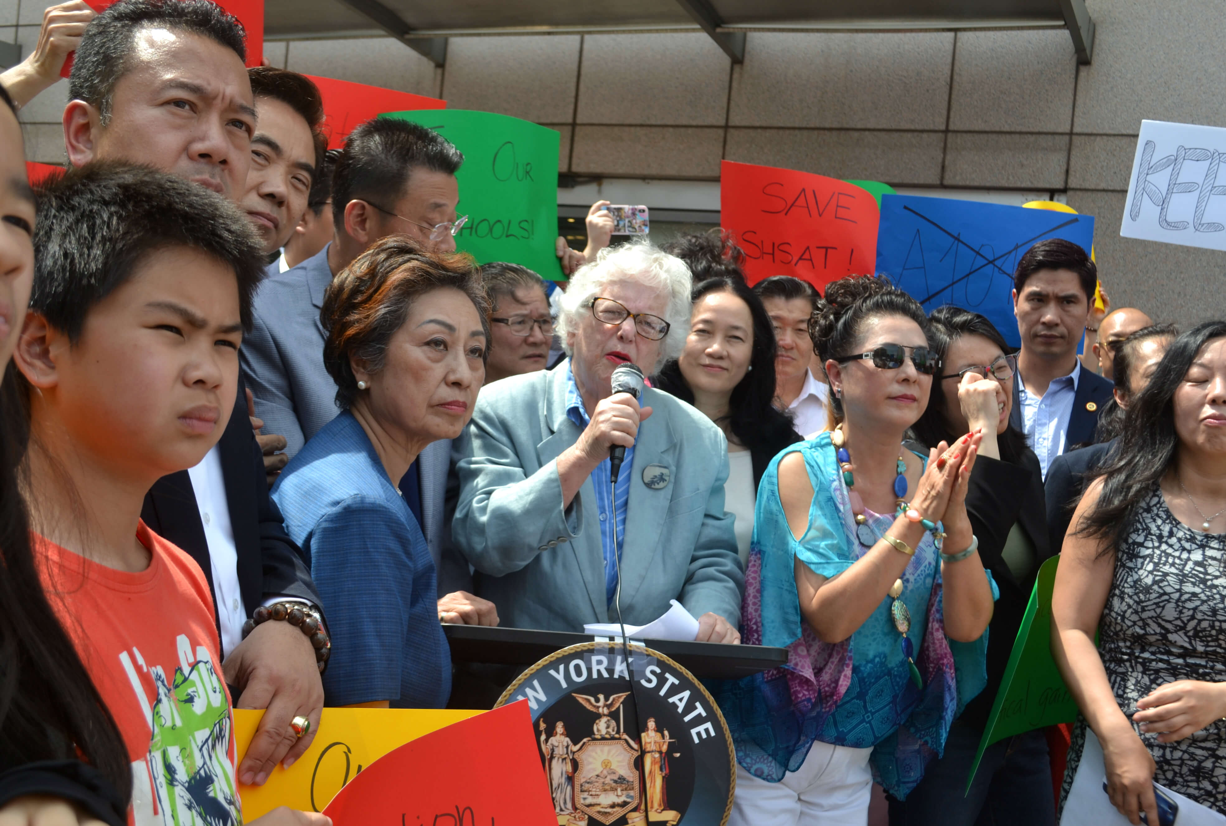 A number of local leaders who spoke said the move unfairly targets Asian Americans, who currently make up 62 percent of students at the specialized schools. Some made reference to the newly appointed schools chancellor’s recent comments on Fox 5 New York.