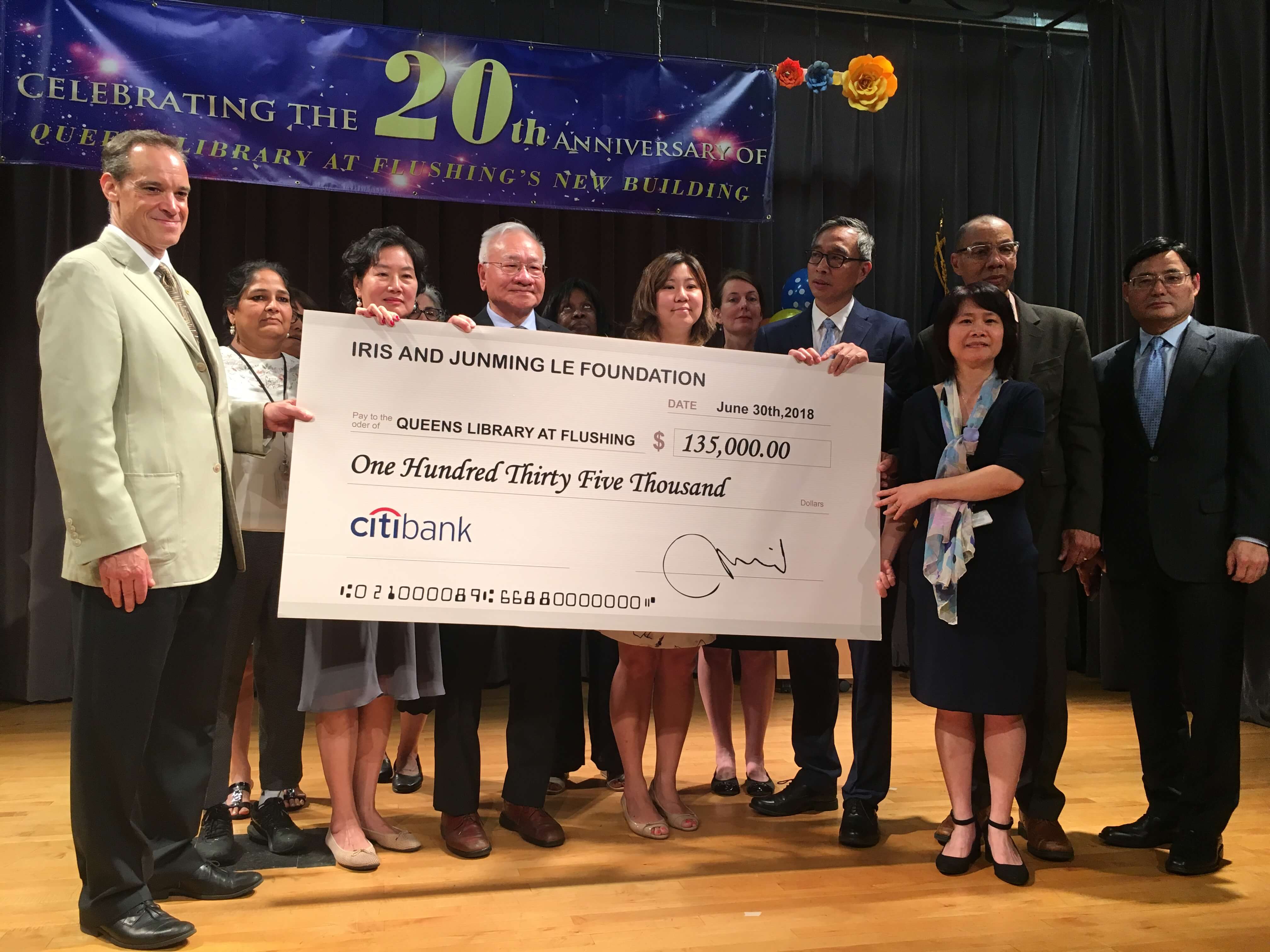 The Iris & Junming Le Foundation presented a $135,000 check to the Queens Library’s Flushing branch during its 20th anniversary celebration on June 30. The event also featured a dance performance, poetry reading and re-dedication ceremony with remarks from Congresswoman Grace Meng and former Queens Borough President Claire Shulman.