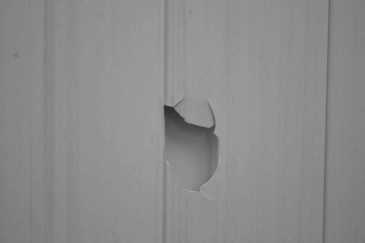 Damage from the golf balls can be seen throughout the residents’ property, including dents in aluminum roof siding, cracked windows and gaping fence holes.