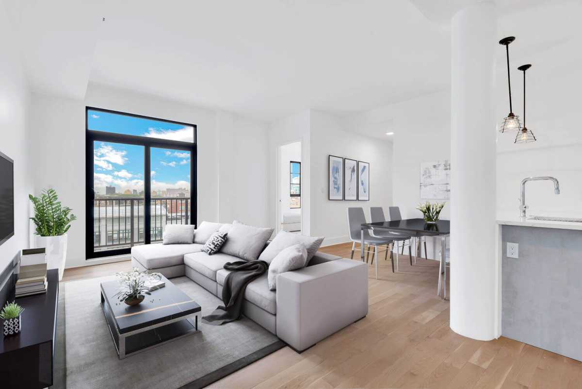 The apartment has great views of the surrounding area and Manhattan skyline. The living space is open plan and the spacious great room opens onto a terrace.