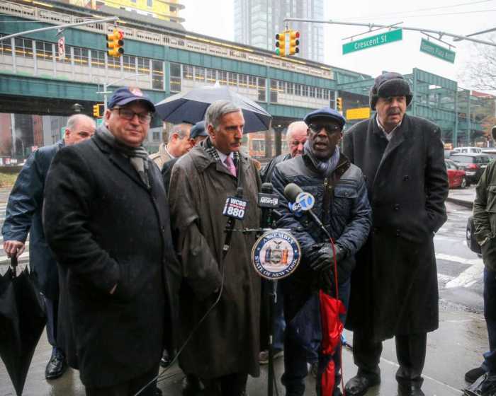 State Assemblyman David Weprin and City Councilmen Barry Grodenchik and Daneek Miller were joined by the Queens Civic Congress, Trucking Association of New York, Keep NYC Free, and concerned outer-borough residents for the Dec. 16 press conference held at 25-01 Queens Plaza North, near the entrance to the Ed Koch-Queensboro Bridge.