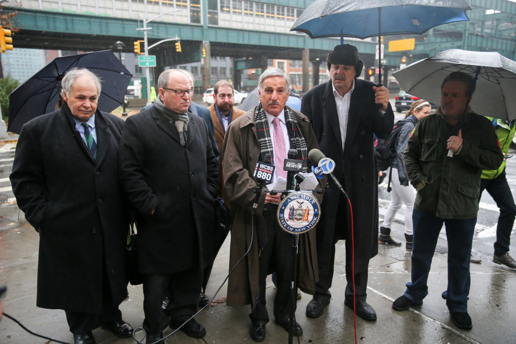 Assemblyman David Weprin and City Councilmen Barry Grodenchik and Daneek Miller were joined by the Queens Civic Congress, Trucking Association of New York,Keep NYC Free, and concerned outer-borough residents for the Dec. 16 press conference Dec. 16 25-01 Queens Plaza North, near the entrance to the Ed Koch-Queensboro Bridge.