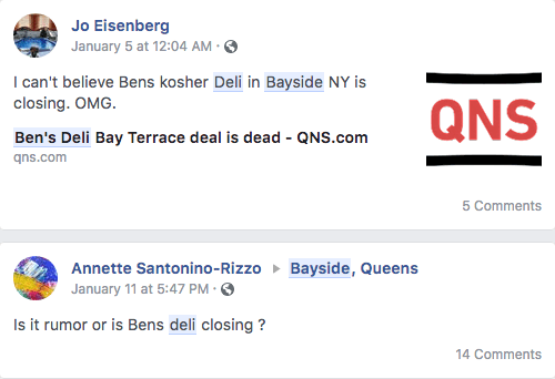 Earlier this month, a 10-year-old QNS story made the rounds on Facebook saying that Ben’s at the Bay Terrace Shopping Center was to close at the end of January 2008 “now that nearly two years of negotiations have failed to produce an agreement between the kosher deli and landlord, Cord Meyer development.”