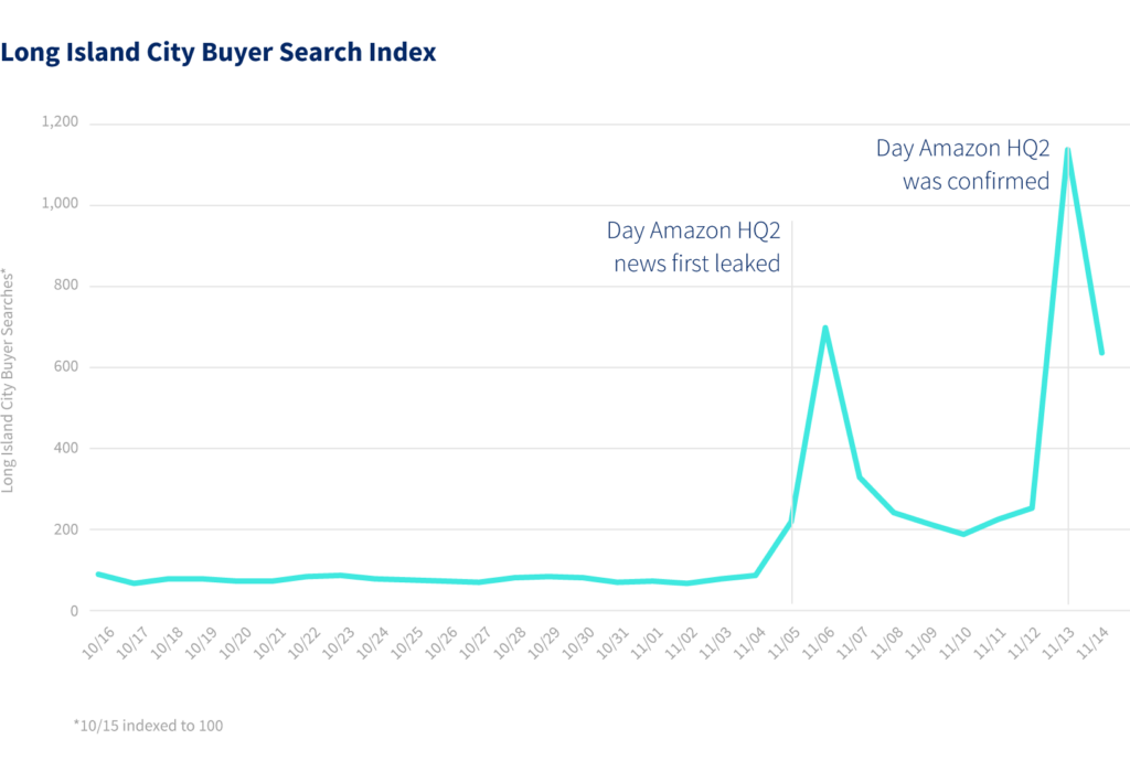 According to StreetEasy, after the news of Amazon’s potential decision to bring the HQ2 to Long Island City, interest in the area skyrocketed. From Nov. 5-7, StreetEasy’s searches went up 283 percent compared to same three days in the prior week (Oct. 29-31). The next week, when the news was confirmed by Amazon, interest shot up 519 percent in search traffic between Nov. 12-14, compared to Oct. 29-31.
