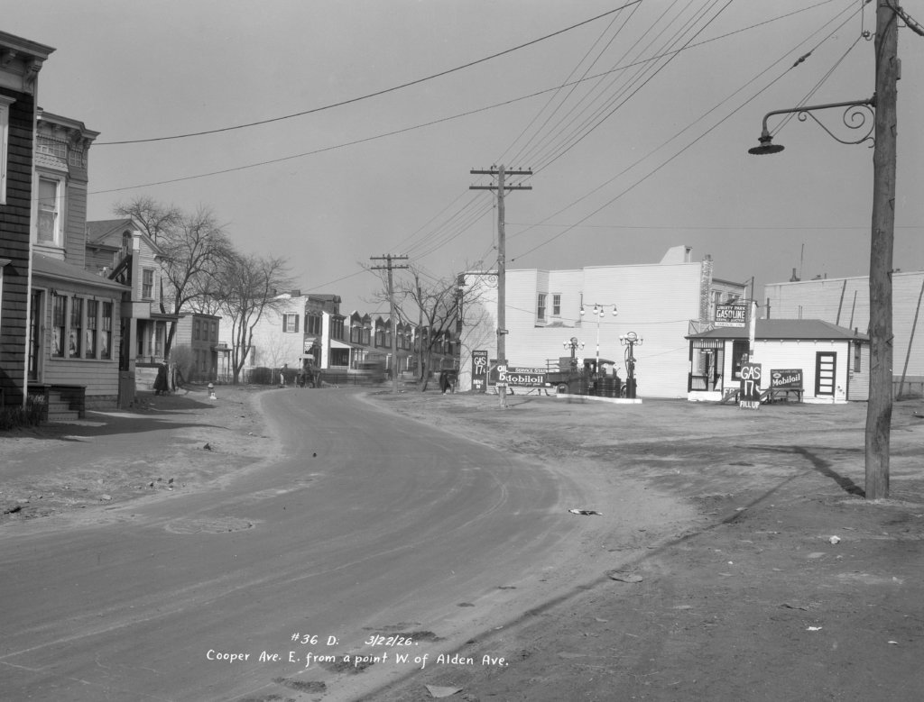 The “Liberty Park” Mobil Oil gas station is shown in this March 1926 photo taken on Cooper Avenue, looking east from the corner of Alden Avenue (present-day 80th Avenue). Back then, gas cost just 17 cents per gallon. (Courtesy NYC Municipal Archives, reprinted with permission)