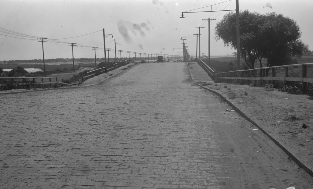 Cobble stones lined what was then called part of Woodhaven Boulevard, but is now known as Cross Bay Boulevard, at Conduit Boulevard (today’s Conduit Avenue) in Ozone Park. The photographer was looking south when this picture was taken, and you can see the low-lying area of Howard Beach in the background, still not yet fully developed. (Courtesy NYC Municipal Archives, reprinted with permission)