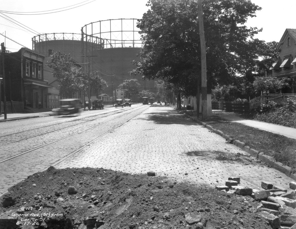The long-gone Elmhurst Gas Tanks are shown in this June 1926 photo towering over Elmhurst. This image was taken during a street construction project, looking west along Grand Avenue near Carter Place (present-day 83rd Place). (Courtesy of NYC Municipal Archives, reprinted with permission)