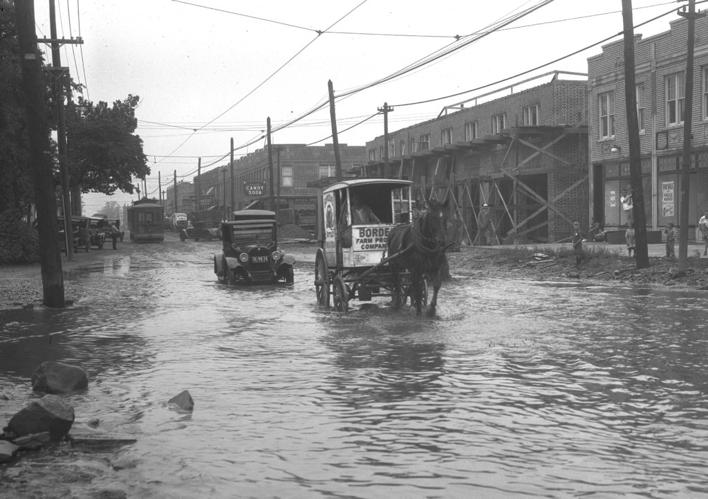 Flooding hit much of Forest Hills following a storm in the summer of 1926. This picture, taken that August, shows a horse-and-buggy, followed by a Ford Model-T, making their way through a flooded Metropolitan Avenue near Ascan Avenue. (Courtesy NYC Municipal Archives, reprinted with permission)