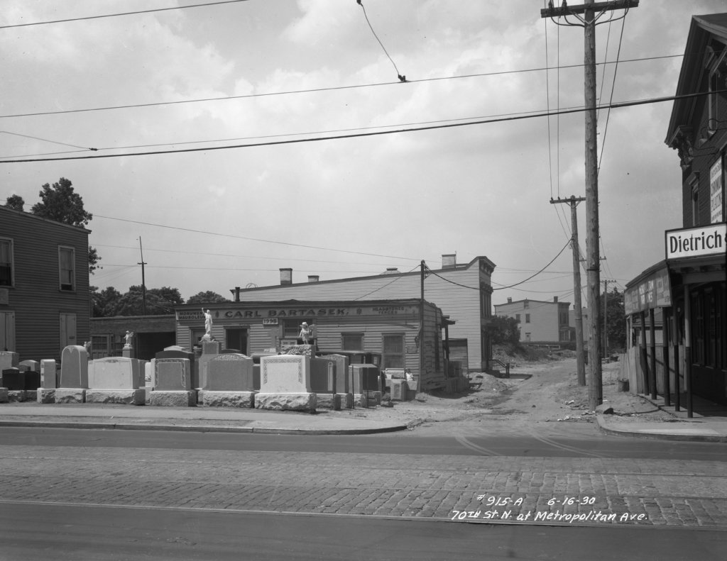 With Lutheran (today All Faiths) and St. John Cemeteries located nearby, Middle Village was once the home of many monument businesses. This 1930 photo shows one of them: Carl Bartasek, who sold tombstones at the corner of Metropolitan Avenue and 70th Street, directly across from Lutheran Cemetery. (Courtesy NYC Municipal Archives, reprinted with permission)