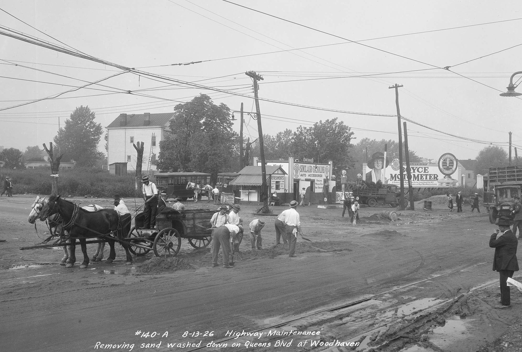 Long before the modern machinery in use today, it took a horse-drawn carriage and men to clean up the streets of Queens. This Aug. 13, 1926 shows one such team at work at the corner of Queens Boulevard and Woodhaven Avenue (now Boulevard) in Elmhurst.
