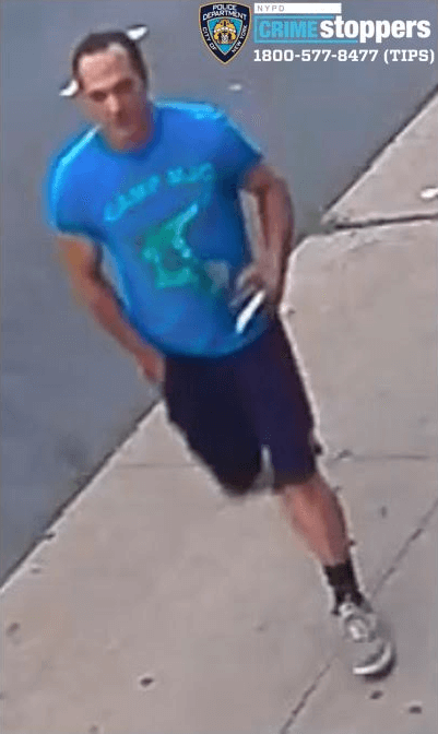 The NYPD described the perpetrator as a Hispanic man in his 40s with black hair, standing 5 feet tall and weighing 190 pounds. He was last seen wearing a light blue shirt, dark-colored shorts and grey sneakers.