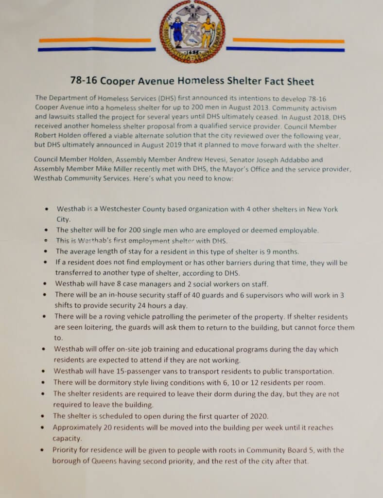 He then read aloud a fact sheet that his office prepared outlining the proposed Glendale shelter, operated by the Westchester County-based nonprofit Westhab.