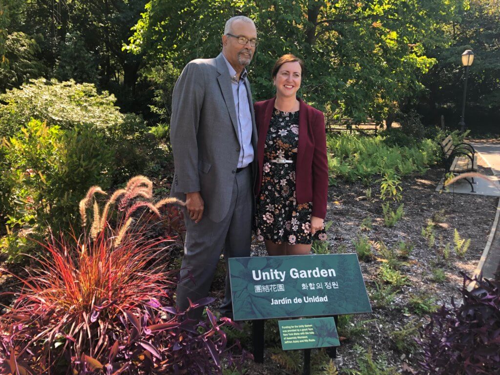 QBG Executive Director Susan Lacerte was joined by Assemblymembers Nily Rozic and Jeffrion Aubry, who contributed a total of $250,000 for the Unity Garden. Special guests included Borough President Melinda Katz, Assemblyman David Weprin, City Councilman Jimmy Van Bramer and QBG board members.