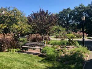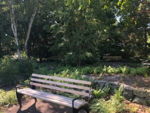 Located in the Gardens on Parade Section at QBG (an area originally modeled after the five-acre exhibit showcased at the 1939-1940 New York World’s Fair) the zone features a new design with a circle of a lawn, surrounded by six elegant 1964 World’s Fair-style benches, pathways, and a combination of plants that do well in shade and sun.