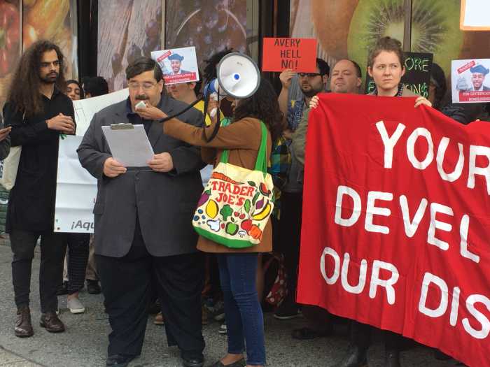 The RTU demanded that city officials stop Avery Hall Investments’ (AHI) plan to build a 24-story luxury apartment building at 1590 Gates Ave., right on top of where the community supermarket, Food Bazaar Supermarket, is currently located.