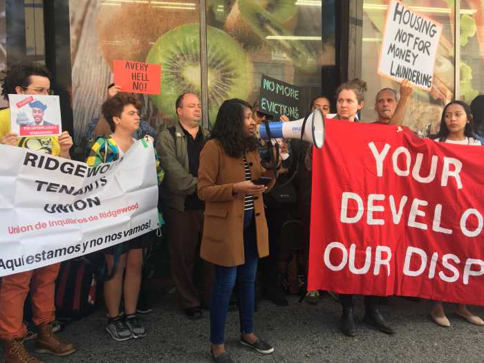 Members of the Ridgewood Tenants Union (RTU) chanted “no, no to luxury colonization — yes, yes to homes for all” in front of Food Bazaar Supermarket during their rally against a planned new luxury apartment tower on Monday.