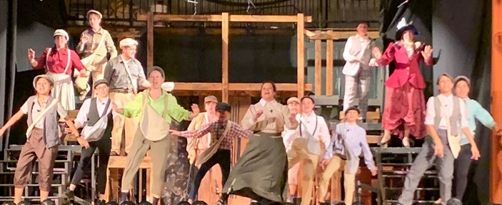 Fiery newsie Jack — who hides a deep, dark past — is played with undeniable conviction and intensity by Louis DiBono. His girlfriend Katherine (Kaitlyn Abdul) has a few secrets of her own. Lovely Jackie Moe very ably portrays Vaudeville dancer/theater owner Medda Larkin. Many of the newsboys are played by girls of all ages. They tuck their hair under their caps to sing, tap dance and help power the show to its stirring conclusion.