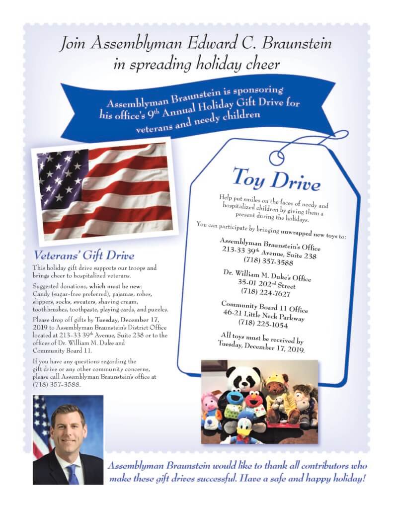 For the ninth year, Assemblyman Edward Braunstein is sponsoring the gift and toy drive for hospitalized veterans and needy and hospitalized children. Last year, Braunstein’s office received thousands of generous donations from District 26 schools, civic and senior organizations and residents.