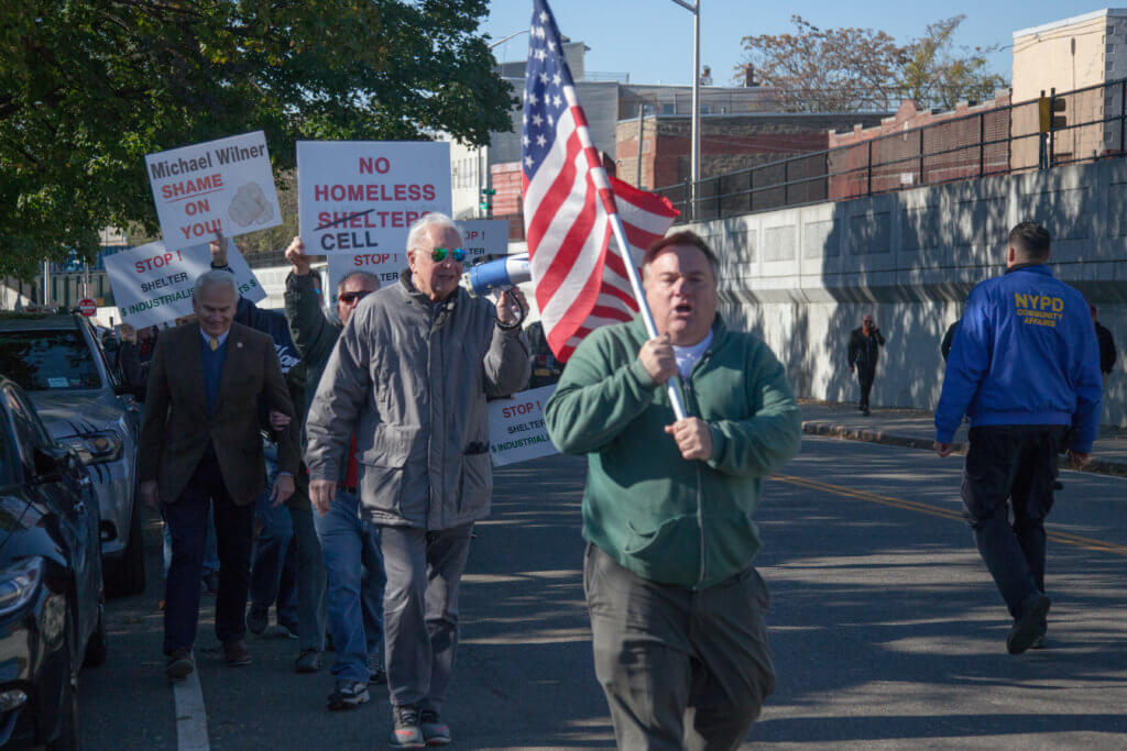 Hundreds of protesters, equipped with signs that depicted the mayor as an evil emperor and “shelter industrialist,” filled both sides of Cooper Avenue at the underpass between 74th and 79th Streets on Nov. 2 to the near-constant sound of cars honking their horns.