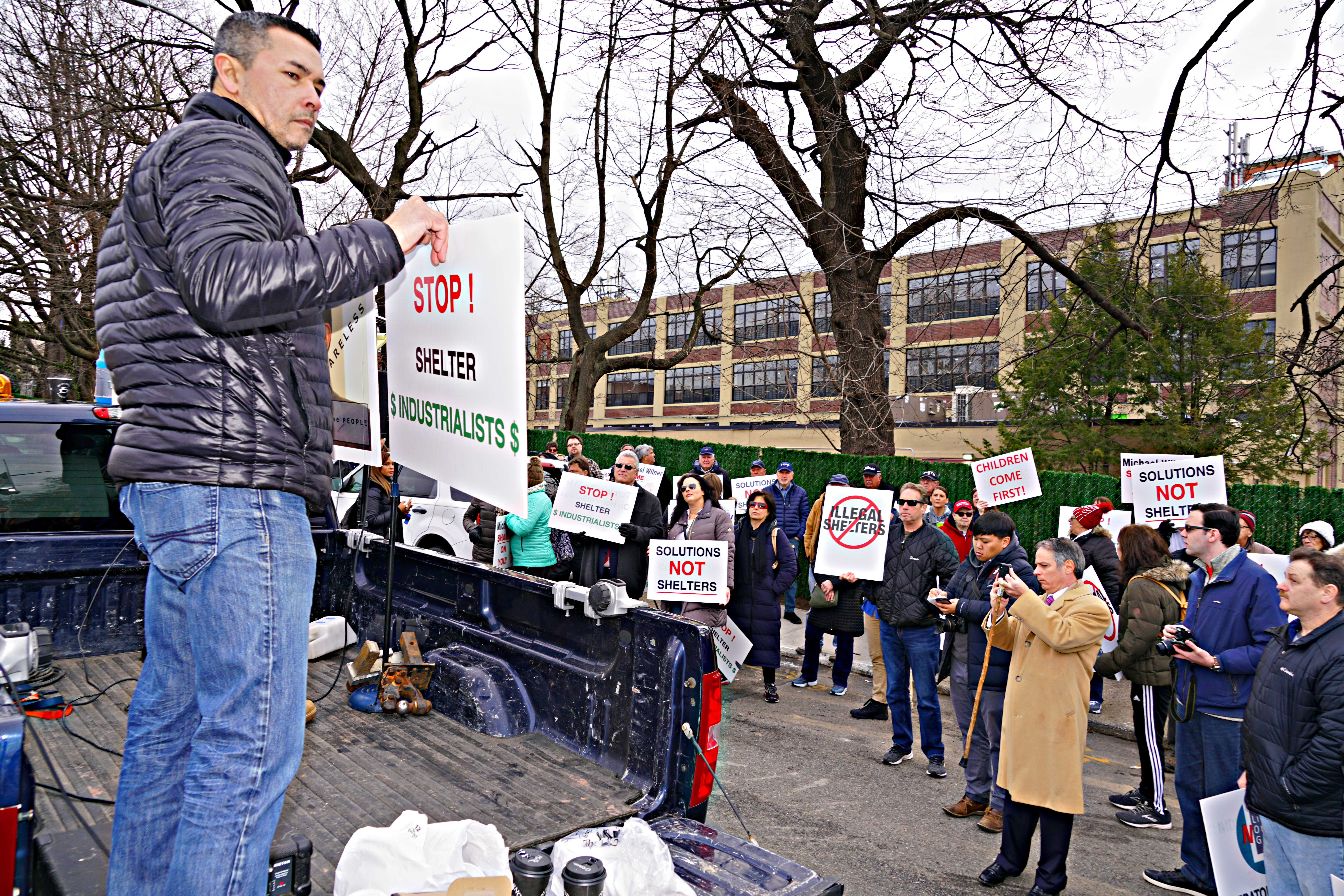 Shelter critic Mike Papa led the rally, claiming that it would be illegal to turn the building to turn the factory into a transient lodging house, and suggesting to the crowd that Mayor Bill de Blasio’s push for the shelter constitutes participation in a racketeering scheme.