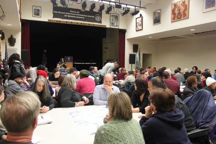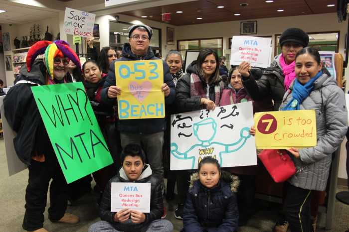 More than 300 bus riders crammed into the Queens Public Library at Langston Hughes on Thursday, Jan. 30, for the MTA’s bus network redesign workshop in Corona.