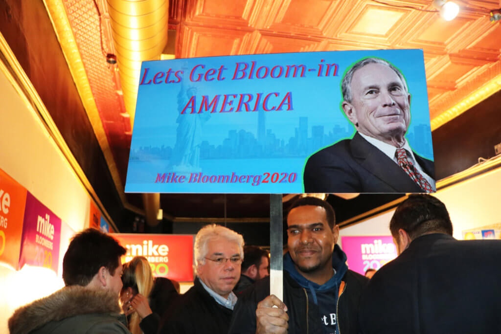 Michael Dacosta, a Bloomberg supporter from Queens, created the slogan “Let’s Get Bloom-in America,” a play on Bloomberg’s name but also a reference to how America would “bloom” with him at the helm. At the field office grand opening, Dacosta brought his handmade sign and custom bomber jacket with the slogan.