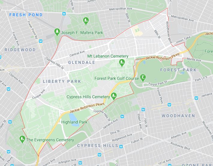 The Glendale area, according to the paper’s analysis, is bounded on the west by the Long Island Rail Road Bay Ridge branch (between the Fresh Pond Rail Yard and the Brooklyn/Queens border at Irving Avenue); on the north by the LIRR Montauk Branch (between the Fresh Pond Rail Yard and Cooper Avenue) and Cooper Avenue (between the Montauk Branch and Woodhaven Boulevard); on the east by Woodhaven Boulevard (to Metropolitan Avenue), Metropolitan Avenue (to the abandoned LIRR Rockaway Beach Branch near Trotting Course Lane); and the LIRR Rockaway Beach Branch (to Myrtle Avenue and Forest Park); and on the south by Forest Park, Mount Hebron Cemetery, Cypress Hills Cemetery, Salem Field Cemetery and Highland Park.