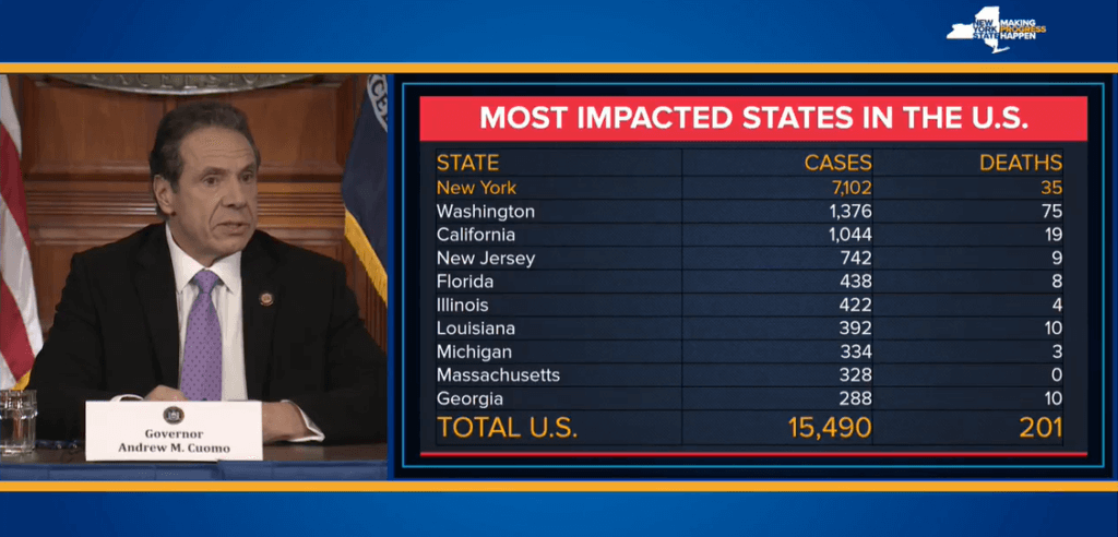 As of Friday morning, March 20, New York state had 7,102 positive coronavirus cases, including 4,408 in New York City. Since March 1, 32,427 New Yorkers have been tested, according to Cuomo.
