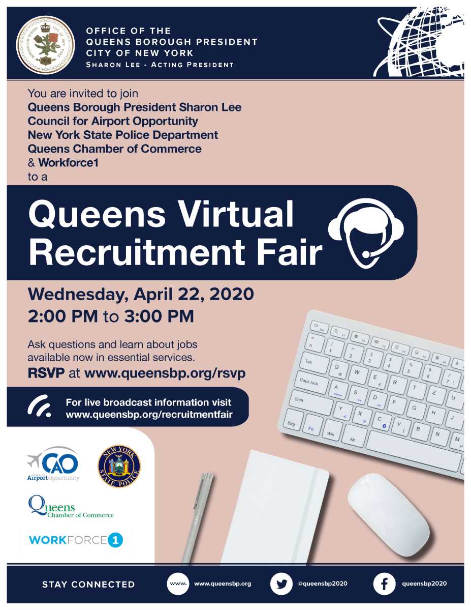 The virtual job fair is spearheaded by Acting Queens Borough President Sharon Lee, the Council for Airport Opportunity, the New York State Police Department, the Queens Chamber of Commerce and Workforce1. The effort comes as unemployment rates reach a record high of more than 1.2 million in New York State and 22 million nationwide due to the COVID-19 pandemic.