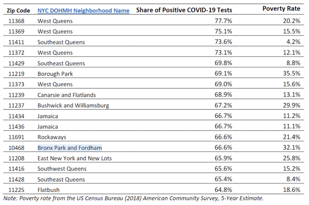 Several other ZIP codes in the city saw high shares of positive COVID-19 tests, including Brooklyn’s 11219 (Borough Park, 69.1 percent), 11237 (Bushwick and Williamsburg, 67.2 percent), and the Bronx’s 10468 (Bronx Park and Fordham, 66.6 percent). According to CCC, many of these areas that have had high COVID-19 positive test rates have higher poverty rates when compared to the rest of the city.