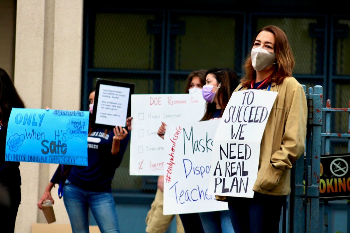 The rally was arranged before Mayor Bill de Blasio announced the start date for in-person schooling will again be delayed.
