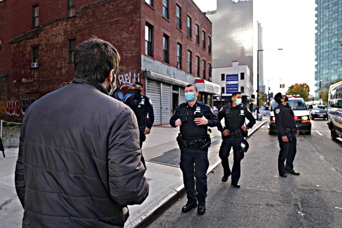 As they marched in Long Island City, someone threw what looked to be a glass bottle from a high-rise building, which smashed on top of a parked car across the street.