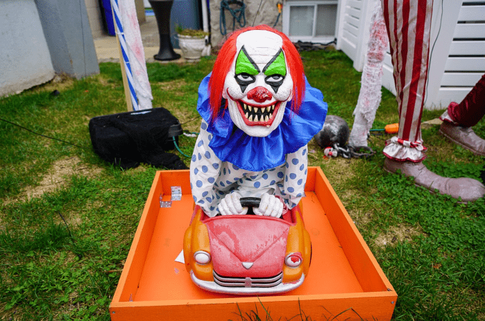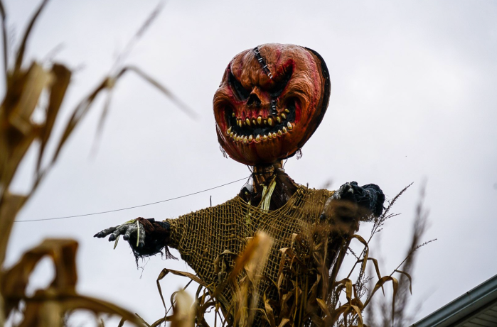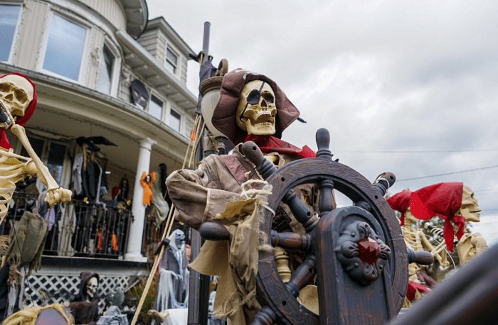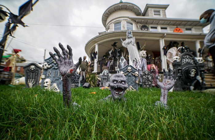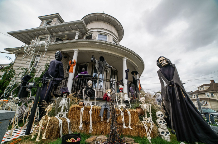 It does have nice wrap-around porch that sets it apart. It also has a spier pointing toward the sky. But beyond its architectural beauties, the only thing that makes the house distinguishable from all other houses is the hundreds of Halloween decorations dotting its lawn.