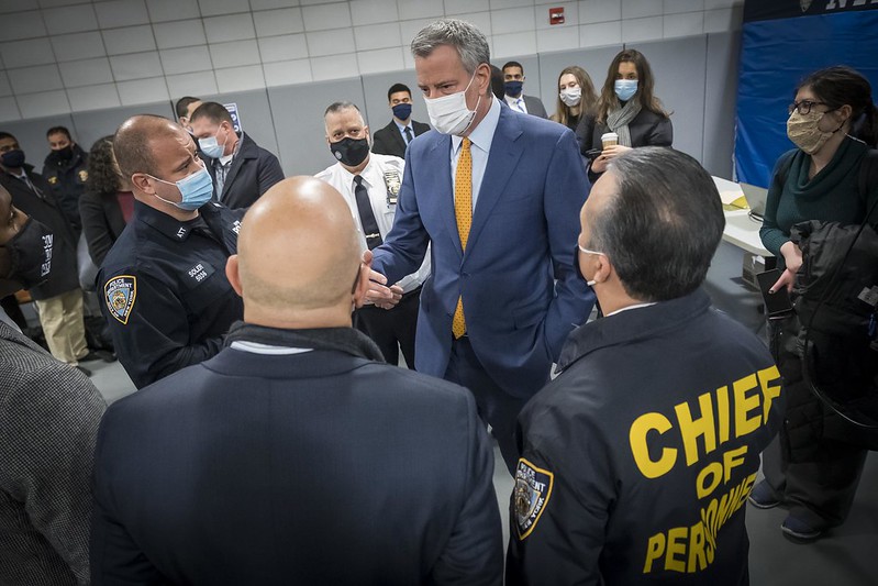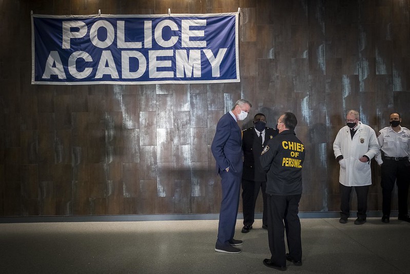 After visiting the vaccine hub at Hillcrest High School, the mayor headed to College Point to meet with NYPD leadership at the Queens Police Academy. The state allowed for police officers and other public safety workers to be eligible to receive the COVID-19 vaccination as phase 1B began on Monday.
