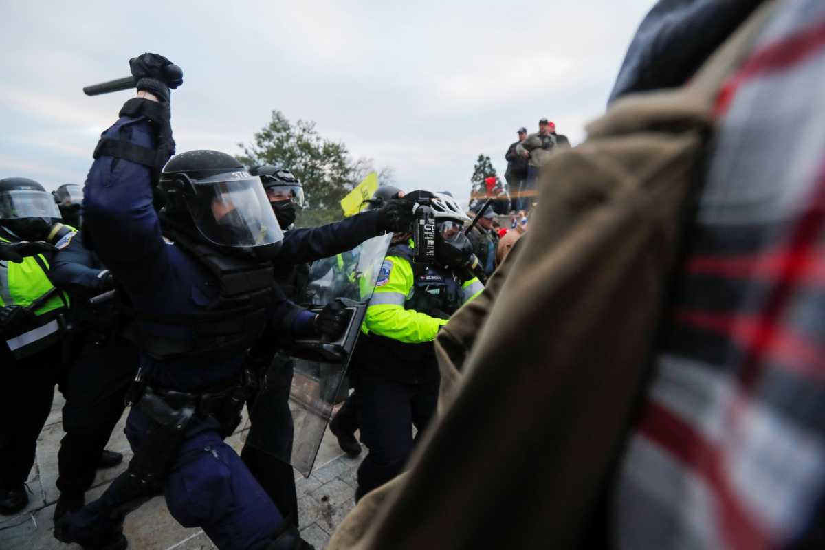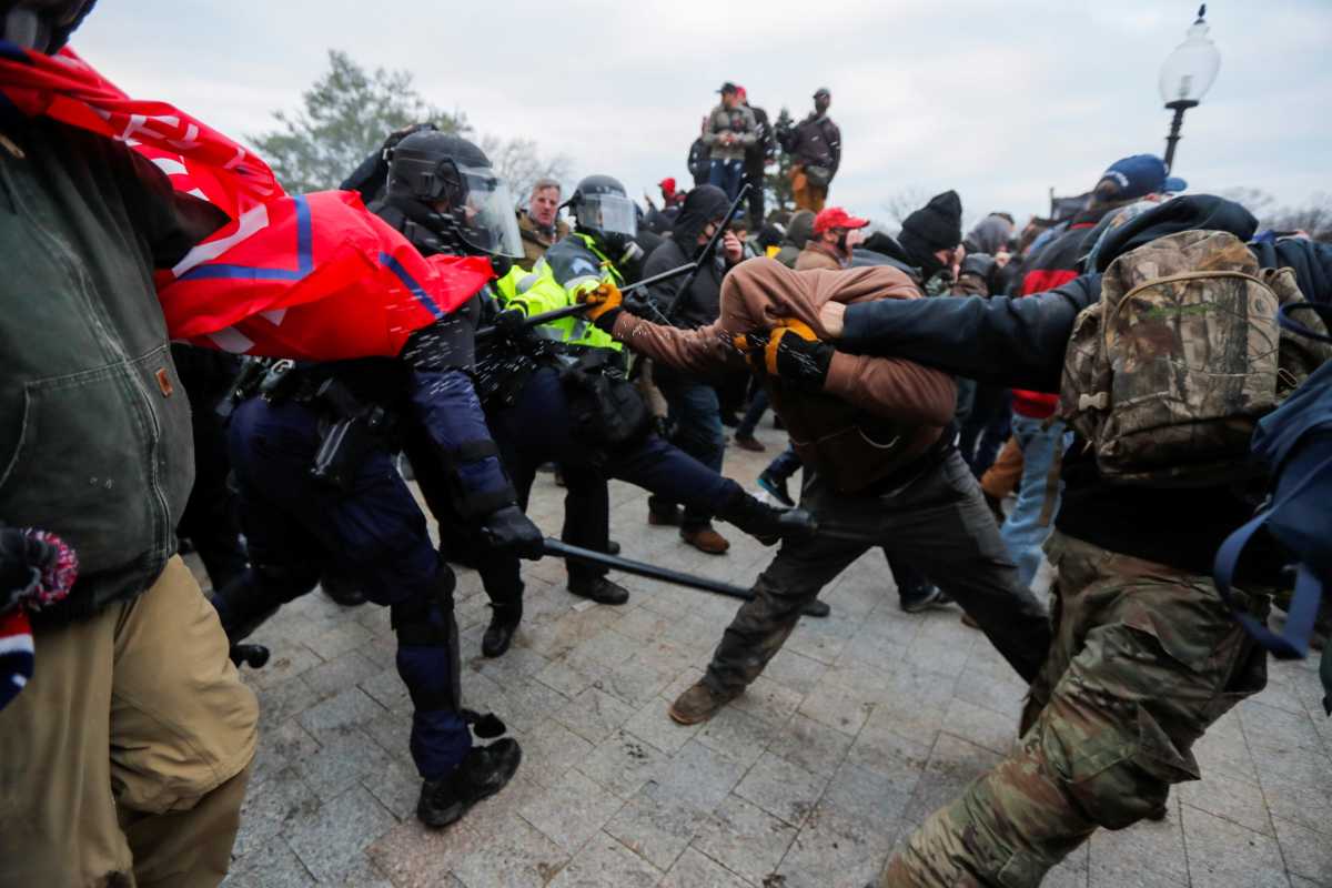 Law enforcement officers scuffle with supporters of U.S. President Donald Trump attempting to enter U.S. Capitol during a protest against the certification of the 2020 U.S. presidential election results by the U.S. Congress, in Washington, U.S., January 6, 2021. REUTERS/Jim Bourg