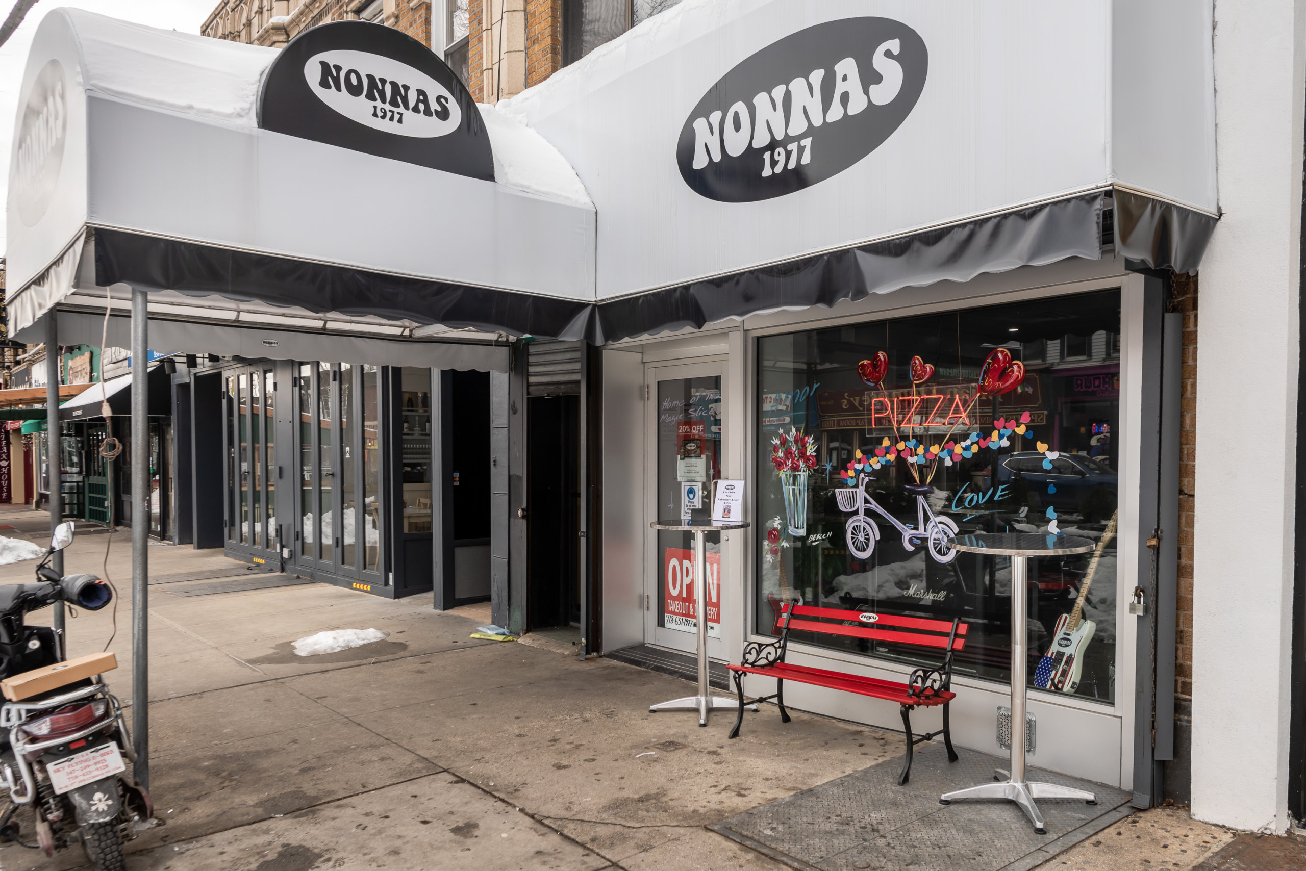 Indoor dining at the Bell Boulevard location — Nonnas 1977 also has a place in Astoria — is limited to four tables, three four-tops, and one two-top, separated by a display case with Nonnas memorabilia and a table adorned with plants.