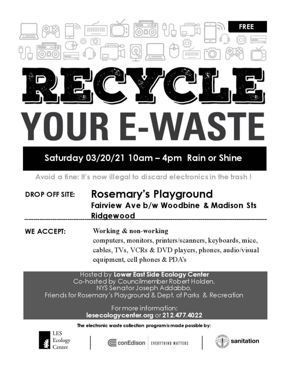 A free electronic waste recycling event is coming to Rosemary’s Playground, located along Fairview Avenue between Woodbine and Madison streets in Ridgewood, on Saturday, March 20.