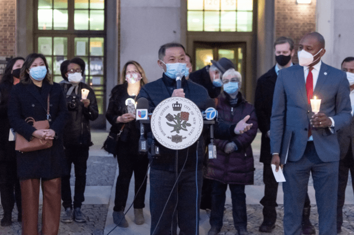 A little more than a month after Queens Borough President Donavan Richards held a press conference addressing the steep rise in AAPI hate crimes, the borough president joined elected officials and members of the community outside Borough Hall on March 29. This time, they were there to remember the victims of the Atlanta mass shooting with a candlelight vigil.