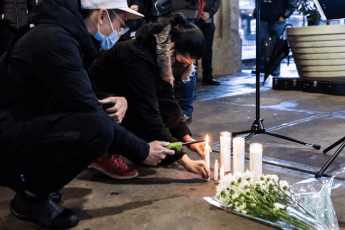 Despite heavy rain, about 100 people gathered for a candlelight vigil in Bliss Plaza in Sunnyside on Thursday, March 18, to honor and mourn the death of the eight people shot and killed by a 21-year-old Georgia man in Atlanta and Cherokee County on Tuesday, March 16.