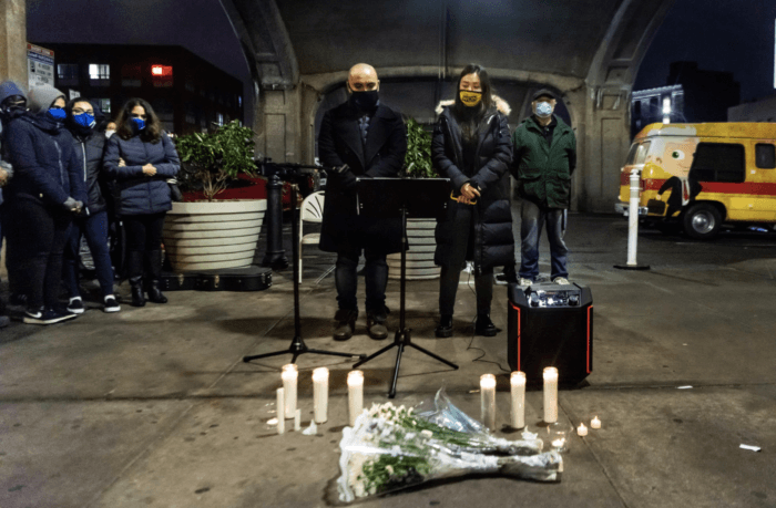 The organizers of the vigil, Julie Won and Steve Raga, are both City Council candidates running to represent District 26. They began the vigil by reading the names of six victims of the identified victims and urged the crowd to repeat the names.