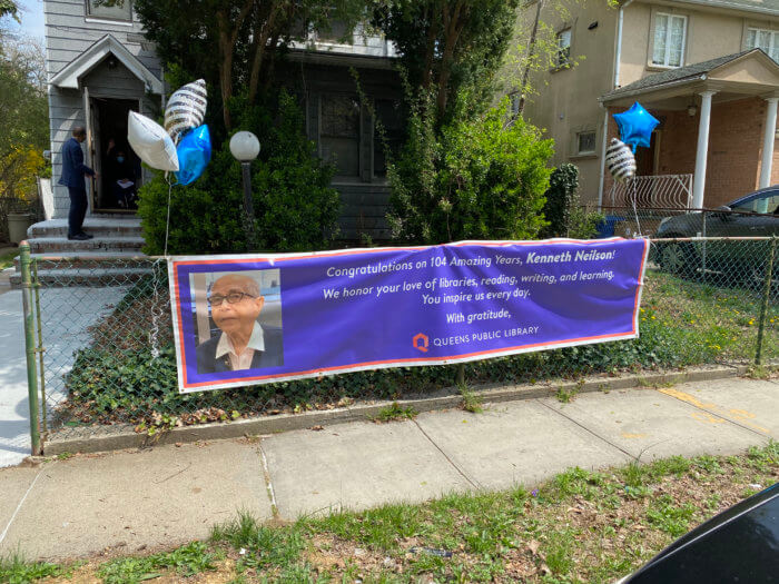 QPL President Dennis Walcott joined Neilson’s family and friends outside the centenarian’s home in Hollis for the celebration. As part of the festivities, the QPL Mobile Library drove by, bedecked with a special banner for Neilson, as part of the bookmobile’s spring mini-tour of neighborhoods around the borough.