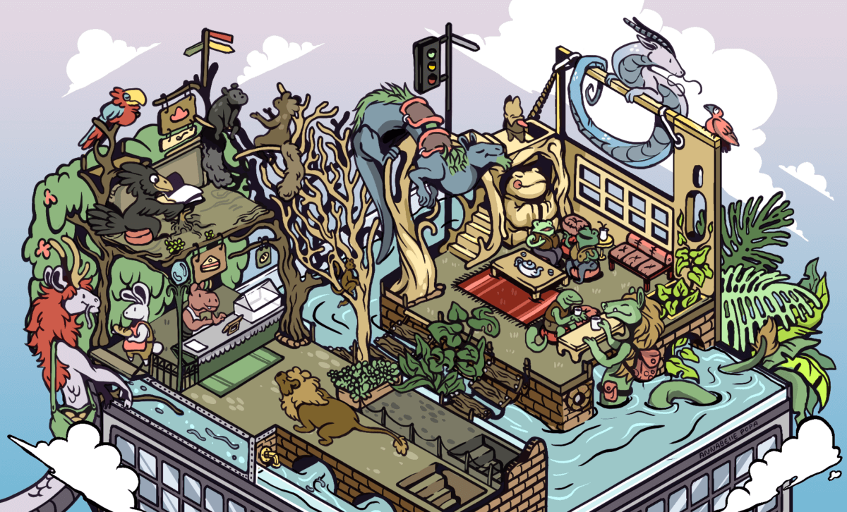 Illustration is her main outlet, and she weaves personal mythologies together with local inspiration to reach undiscovered worlds. Her piece combines all the memories and nostalgia of growing up in the city to create a fantastical depiction of what the roof of the Shops at Skyview might look like.